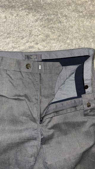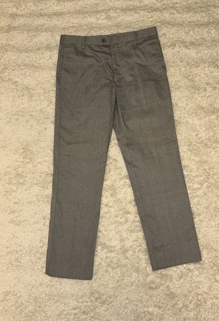 Pantaloni eleganti di colore grigio, perfetti per un look curato. - Tessuto leggermente texturizzato. - Chiusura con bottone e zip. - Tasche laterali. - Vestibilità dritta.