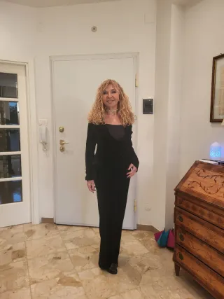 Vestito da sera nero con brillantini sulla scollatura a v davanti,e schiena scoperta . tessuto poliestere 100/100. Molto carino e elegante.