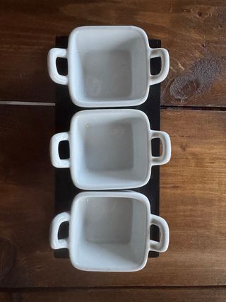 Elegante set di tre portastuzzichini quadrati con manici, perfetti per servire antipasti o salse. - Base in legno scuro. - Ciotoline in porcellana bianca. Molto bellino ! Ciotoline porta stuzzichini con vassoietto Misure vassoio 11x23 Misure ciotoline 7x7 In perfetto stato le ciotoline Un paio di sbucciature sul vassoio, recuperabili con un pennarello