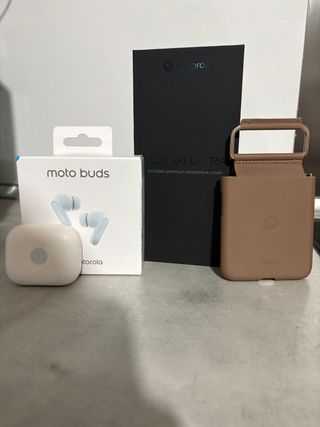 Set composto da auricolari wireless Motorola Moto Buds e cover protettiva per Motorola RAZR 60 Ultra. - Auricolari wireless Moto Buds. - Cover protettiva in ecopelle color cuoio per RAZR 60 Ultra. - Logo Motorola presente su entrambi gli articoli.