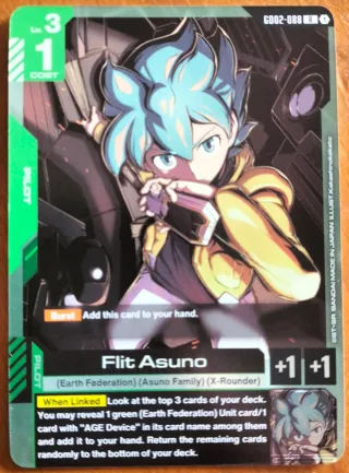 Carta Flit Asuno GD02-088 R1, edizione rara foil. - Livello 3, Costo 1. - Effetto Burst: Aggiungi questa carta alla tua mano. - Effetto When Linked: Guarda le prime 3 carte del tuo mazzo. Puoi rivelare 1 carta Unità verde (Earth Federation)/carta con AGE Device nel nome tra esse e aggiungerla alla tua mano. Restituisci le carte rimanenti in fondo al tuo mazzo in modo casuale. - Attacco +1, Difesa +1. - Illustrazione di Kakashinokakato.