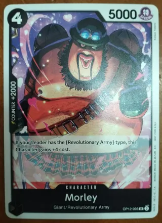 Carta Morley dal set OP12-093 UE 3. Personaggio Giant/Revolutionary Army. - Costo: 4 - Potenza: 5000 - Counter: +2000 - Effetto: Se il tuo Leader ha il tipo {Revolutionary Army}, questo Personaggio guadagna +4 costo.