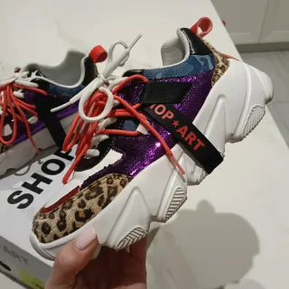 Sneakers di Shop Art con un design audace e colorato. - Tomaia in pelle bianca con dettagli animalier leopardato. - Inserti in glitter viola e tessuto blu. - Lacci arancioni vivaci. - Suola chunky bianca.