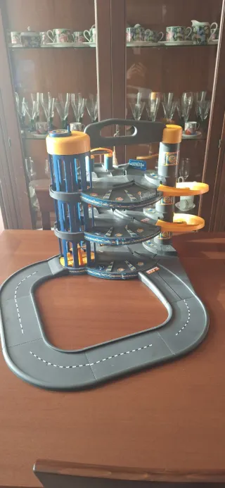 Parcheggio giocattolo multistorey con rampe e ascensore, pompa di benzina, pezzi di ricambio per fare la strada piu lunga, stickers con segnali stradali e foglio illustrativo - Struttura in plastica blu e gialla. - Pista a più livelli. - Include una piccola rampa d'accesso.