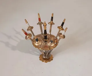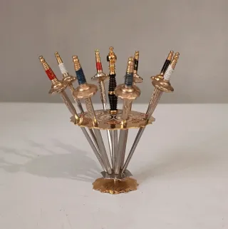 Splendido e originale set da aperitivo/cocktail d'epoca,composto da un supporto centrale a due livelli e 12 spiedini/stecchini in metallo. Ogni spiedino è una miniatura dettagliata di una spada storica (Sciabole,stucchi,spade crociate) Il supporto presenta decorazioni geometriche e una base stabile con motivo a greca. Prodotto in Spagna tra gli anni '60/'70,le miniature di spade riproduco quelle storiche,famose per la lavorazione dell'acciaio di Toledo. Perfetto per collezionisti,decorazione bar o per un aperitivo dal gusto Retrò storico. Ottime condizioni Qualche normale segno del tempo. H cm 15 Larghezza cm 7 Spadine cm 8 circa