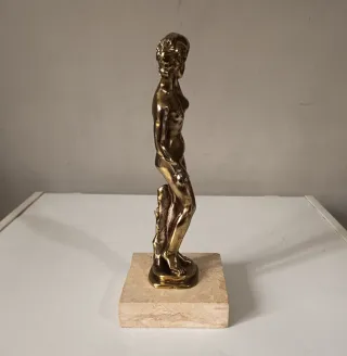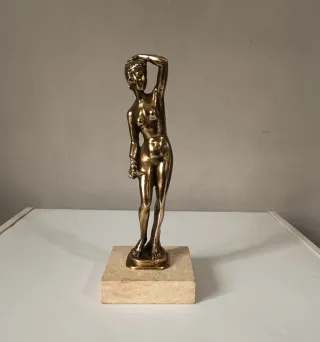 Splendida scultura vintage nudo femminile in posa classica,probabilmente ispirata alle classiche rappresentazioni di Afrodite,realizzata in metallo dorato (Ottone/bronzo fuso) con bellissima lucentezza naturale. La figura poggia su base in marmo travertino,che ne esalta lo stile raffinato. Il design sinuoso si ispira chiaramente al periodo Art Decò,rendendolo un pezzo d'arredamento perfetto per ambienti vintage,Mid - Century o moderni. Dettagli molto accurati nei particolari anatomici e posa. Misure Altezza cm 26 Larghezza cm 10