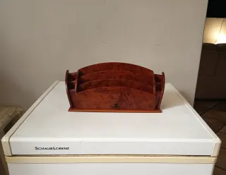 Elegante e raffinato organizer da scrivania d'epoca. Spettacolare pezzo di antiquariato stile Retro'. L'oggetto è caratterizzato dalla preziosa lavorazione del legno in Radica di Tuia con le sue tipiche e affascinanti venature. Realizzato a 3 ampi scomparti divisori per lettere e documenti,base con cassetto estraibile,2 portapenne/oggetti integrati ai lati.Perfetto per una scrivania importante,uno studio professionale o come arredo Retrò.Pezzo riconducibile agli anni 50/60 Splendide condizioni estetiche,come da foto,legno lucido e ben conservato. Misure Altezza cm 13 Larghezza cm 30 Profondità cm 10