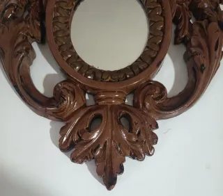 Elegante specchiera vintage di forma ovale in stile Barocco/Rococò caratterizzato da una cornice riccamente decorata con volume e dettagli floreali. Il materiale è un composito solido di polvere di marmo che conferisce al pezzo un buon peso e una grande definizione nei dettagli. Ottimo stato di conservazione vintage,lo specchio è integro e originale d'epoca. Presenta normali segni del tempo,che ne attesta l'originalità e il fascino d'epoca. Perfetto per un ingresso o come pezzo d'accetto in un corridoio.Puo essere appeso alla parete o appoggiato. Misure Altezza cm 38,5 Larghezza cm 33