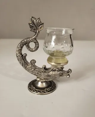 Splendido e originale Portacandela vintage,caratterizzato da una base in metallo argentato a forma di creatura marina mitologica o araldica. ViPezzo d'impatto visivo molto scenografico. In stile neoclassico,riprende il design delle antiche saliere o dei calamai da scrivania dei secoli scorsi. Ampolla in vetro trasparente con lavorazione a diamante nella parte inferiore, incastonata sulla base. Ottime condizioni vintage,con una bellissima patina del tempo che ne esalta i rilievi. Misure Altezza cm 9,5 Larghezza cm 8