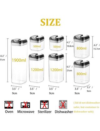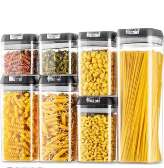 Set di 7 contenitori ermetici per alimenti, ideali per organizzare la dispensa. - Coperchio nero con chiusura ermetica. - Corpo trasparente per vedere il contenuto. - Realizzati in plastica resistente.