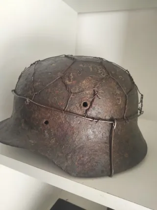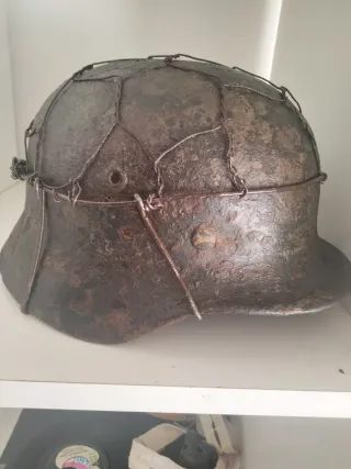 Elmetto tedesco, autentica reliquia storica. - Materiale metallico con segni del tempo. - Rete metallica applicata esternamente. - Dettagli di fissaggio visibili.