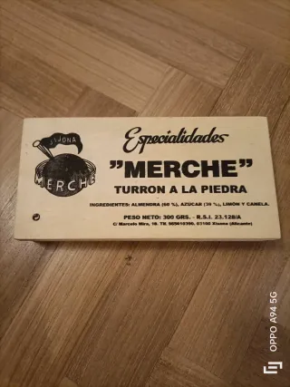 Scatola in legno con decorazioni e scritte. - Scritta JIJONA - Scritta MERCHE - Scritta Especialidades - Scritta MERCHE - Scritta TURRON A LA PIEDRA - Ingredienti: Mandorla (60%), Zucchero (39%), Limone e Cannella. - Peso netto: 300 grs. - R.S.I. 23.128/A - Indirizzo: C/ Marcelo Mira, 18. Tel. 965610390. 03100 Xixona (Alicante)