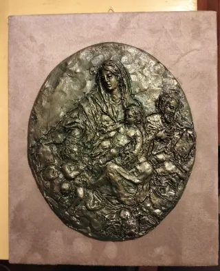 Bellissimo quadro decorativo da appendere. - Raffigurazione sacra in rilievo. - Finitura metallica anticata. - Montato su telaio in tessuto.