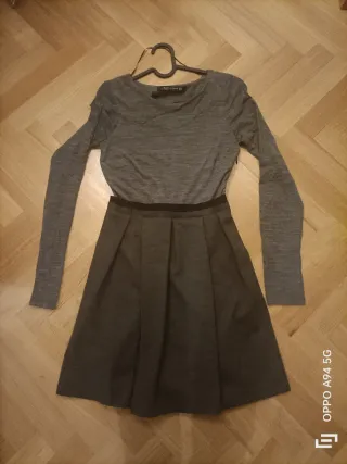 Elegante vestito Zara grigio, perfetto per ogni occasione. - Maniche lunghe. - Gonna a pieghe. - Cintura nera.