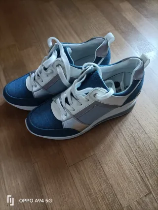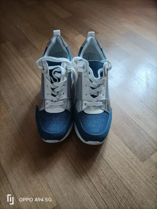 Scarpe sportive da donna con un design moderno e accattivante. - Tomaia in denim blu e dettagli argento. - Lacci bianchi. - Suola bianca.