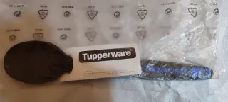 Cucchiaio della linea Tecna di Tupperware. Utensile da cucina della linea Tecna, specificamente un cucchiaio universale, nei colori nero e blu, lungo circa 30 cm. È resistente al calore fino a 200°. Ergonomico, lavabile in lavastoviglie. Multiuso in cucina. Nuovo. Originale. Mai utilizzato. Ancora imballato.