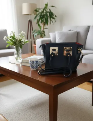 Borsa vera pelle rigida blu con dettagli oro