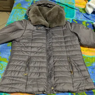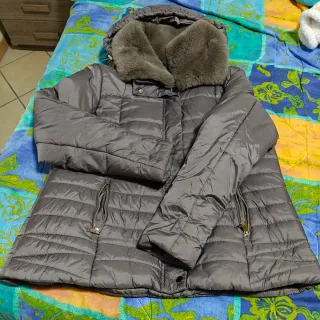Elegante giubbino imbottito con cappuccio bordato in pelliccia sintetica. - Chiusura frontale con zip. - Tasche laterali con zip. - Polsini elasticizzati.