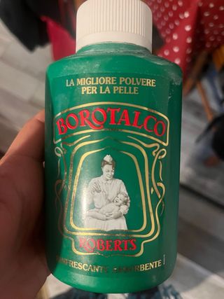 Polvere Borotalco Roberts, ideale per la pelle. - Fresca e assorbente. - Confezione verde e bianca.