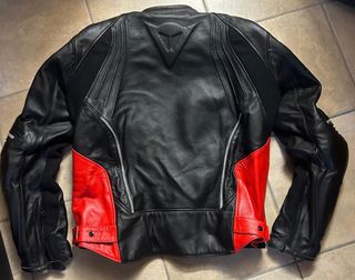Tuta divisibile Dainese in pelle, taglia 56. Design sportivo con inserti rossi e protezioni. - Logo Dainese stampato sul petto e sulle maniche. - Protezioni rigide su spalle e gomiti. - Inserti in pelle rossa sui fianchi e sulle braccia. - Zip di chiusura frontale. - Zip per unire giacca e pantaloni.