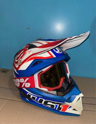 Casco da cross Just1 in taglia L, completo di maschera 100%. - Design colorato con grafiche rosse, bianche e blu. - Maschera con lenti a specchio. - Logo 100% sul cinturino della maschera.