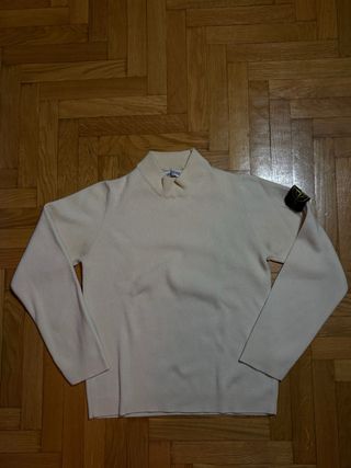Maglione Stone Island color beige con collo alto. - Patch Stone Island sulla manica sinistra. - Tessuto a coste.