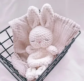 Morbido dou dou a forma di coniglietto, perfetto per i più piccoli. Realizzato in filato soffice e piacevole al tatto. - Design a forma di coniglio. - Colore bianco. - Materiale in filato peluche.