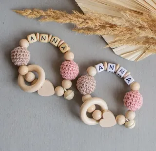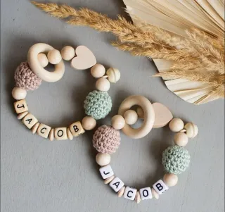 Set di giochi per neonati con perline di legno e elementi in crochet. Personalizzabile con il nome. - Perline in legno naturale. - Elementi in crochet morbido. - Anelli in legno. - Cuori in legno.