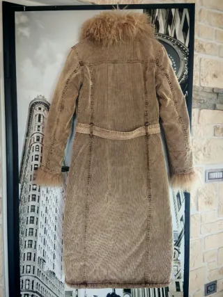 Elegante cappotto lungo in velluto a coste beige, fodera trapuntata perfetto per le giornate più fredde. Capo vintage ricercato associato allo stile "Penny line " degli anni 70. - Dettagli in pelliccia sintetica su collo e polsini removibili tramite bottoni. - Cintura in vita per un fit personalizzato. - Chiusura frontale con bottoni. - Tasche applicate sul petto e sui fianchi. Misura 42/S fare riferimento alle foto.