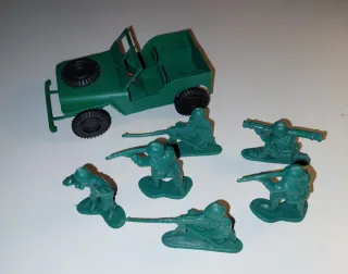 Set di soldatini in plastica verde. - Jeep militare verde. - Soldatini vari. - Molti accessori aggiuntivi. I soldatini nella foto con la jeep e quelli nell'altra foto hanno scale diverse di grandezza.