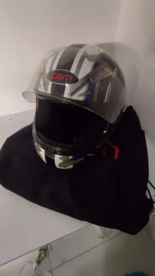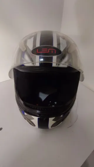 Casco da moto con un design accattivante. - Logo LEM in rosso. - Visiera trasparente. - Strisce bianche, blu e nere.