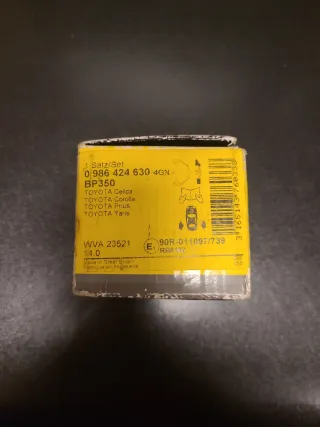 Set di pastiglie freno per vari modelli Toyota. - Riferimento: BP350 - Codice: 0 986 424 630-4GN - Omologazione: 90R-011097/739 - WVA: 23521 Modelli compatibili: TOYOTA: YARIS (_P1_) YARIS VERSO (_P2_) CELICA Coupé (_T23_) COROLLA Station Wagon (_E12_) COROLLA Sedán (_E12_) COROLLA Verso (_E12_) PRIUS Liftback (_W2_) PRIUS Sedán (_W1_) YARIS VERSO VAN (_P2_)