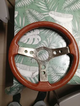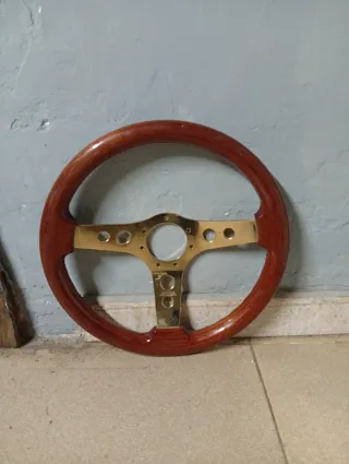 Volante classico OBA con cerchio in legno e dettagli dorati. - Cerchio in legno lucidato. - Raggi e centro in finitura dorata. - Design sportivo ed elegante.