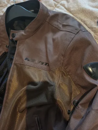 Giacca da moto REV'IT di colore marrone. - Tessuto tecnico traspirante. - Inserti in mesh. - Logo REV'IT sul petto e sulla manica. - Protezioni integrate. - prima di acquistare controllate la taglia, sono 170x75 circa e va benissimo