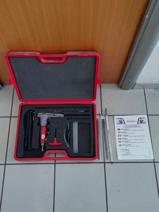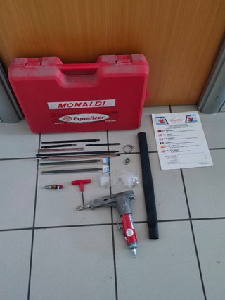 Vendo Equalizer modello AEB405 E dispositivo per staccare i vetri dell’automobile dall’interno. Strumentazione da carrozzeria. Questo strumento brevettato viene utilizzato per tagliare le guarnizioni delle finestre incollate dall'interno del veicolo. rogettato per tagliare l'uretano che trattiene il vetro nei veicoli. La lama si muove all'interno di una guaina metallica che protegge il cruscotto, le modanature di guarnizione e il rivestimento del padiglione. Comprende 4 lame, 1 guaina, 1 chiave esagonale, 1 paio di occhiali da sicurezza, custodia per il trasporto e istruzioni originali