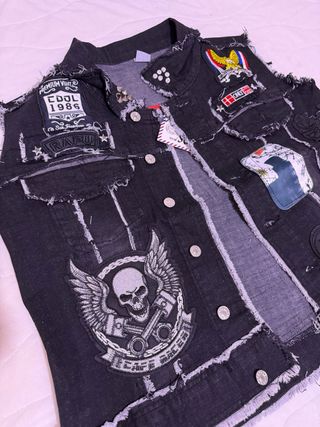 Gilet in denim nero con patch stile urban e moto. - Patch Cool 1986 - Patch Cafe Racer Skull & Wing - Patch con aquila e bandiera - Patch con bandiera danese e inglese - Dettagli borchie