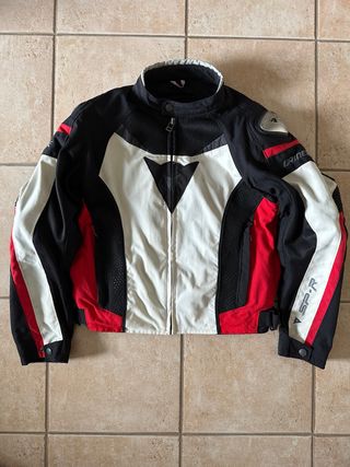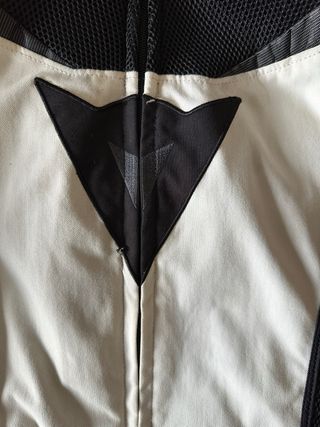 Giacca da moto Dainese modello SP-R. - Design bicolore bianco e nero. - Dettagli rossi. - Protezioni sulle spalle e interni. - Logo Dainese sul petto e sulla manica.