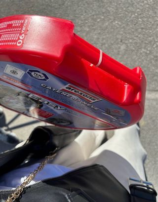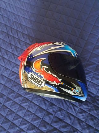 Casco da moto originale Shoei modello X-Spirit Norick 5, replica del casco usato in pista dal famoso pilota Norick Abe. Misura 57-58 centimetri, colore blu/rosso/giallo. Monta una bellissima visiera a specchio di colore blu spectra. Fornisco anche la visiera originale trasparente (nuova, mai utilizzata), il sacco portacasco, mentoniera di ricambio, viti di ricambio, kit di pulizia e manuale di istruzioni. Il casco all'esterno è come nuovo, solo nella parte inferiore ci sono piccoli segni di usura (sulla pelle) ma niente di particolare. Bellissimo e introvabile, da collezione. Solo per gli amanti del genere