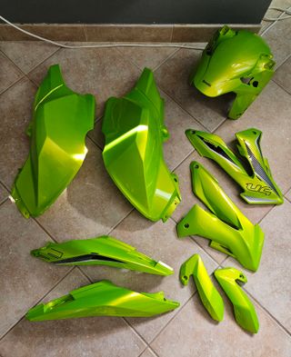 Vendo kit completo di plastiche originali per il Benelli bn125 colorazione verde neon. Tutto il lato destro é in perfette condizioni e anche entrambe le carene del faro e il parafango anteriore sono perfetti senza alcun difetto; invece la plastica del serbatoio sinistro, il fianchetto sinistro e il codone sinistro hanno alcuni difetti dovuti da una piccola caduta da fermo. La carena sinistra del serbatoio presenta una piccola abrasione sul lato, il fianchetto sinistro lo stesso e purtroppo il codone sinistro oltre ad essere un po' abraso é anche un po' crepato (tutti i difetti sono visibili nelle foto).