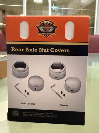 Set di copri dadi per asse posteriore Harley-Davidson. - Finitura Satin Chrome. - Finitura Chrome. - Include chiavi a brugola e viti. mai aperto