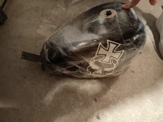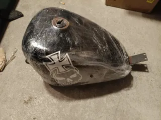Serbatoio per moto Harley Davidson. - Colore nero lucido. - Decorazione con adesivo a forma di croce di ferro e teschio. - Presenta una staffa metallica di fissaggio.