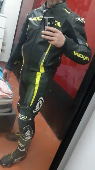 Tuta da moto IXON in due pezzi Giacca taglia 56 Pantaloni taglia 54 in ottime condizioni generali - Tuta in pelle. - Inserti gialli. - Protezioni integrate.