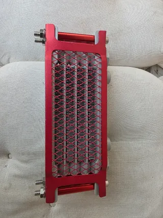 Radiatore per raffreddamento olio, ideale per pitbike. - Struttura in alluminio. - Design alettato per massima dissipazione. - Telaio rosso. - foro bulloni M10