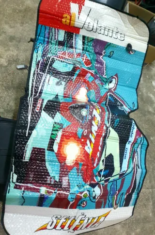 Parasole personalizzato per Alfa Romeo con grafica al Volante. - Design unico e colorato. - Protegge dall'irraggiamento solare. - Facile da installare e rimuovere.