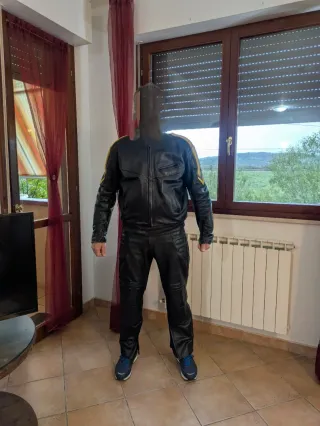 Tuta in pelle in due pezzi da turismo, invernale,marca Frank Thomas taglia L ,io sono 1,80 x 78kg imbottita,Sobria , pantalone usato pochissimo, giacca in buone condizioni - Giacca in pelle nera con dettagli gialli. - Pantaloni in pelle nera. - Chiusura con cerniera sui pantaloni.