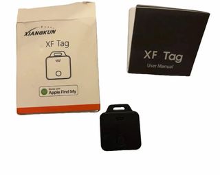 Dispositivo XF Tag, compatible con Apple Find My. - Diseño compacto. - Incluye un círculo central y un área con puntos.