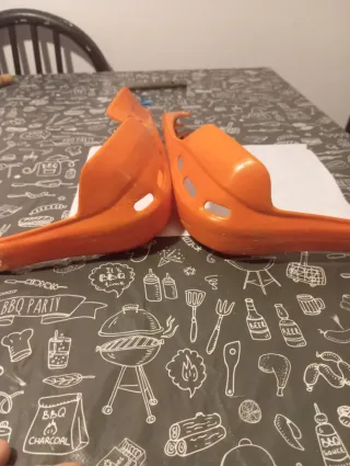 Protezioni per manubrio moto di colore arancione. - Design aerodinamico. - Materiale plastico resistente.