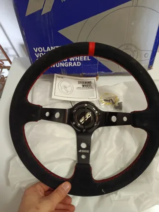 Volante occhiali Motor Sport in pelle scamosciata nera con cuciture rosse. - Materiale: pelle scamosciata. - Colore cuciture: rosso. - Logo occ sul mozzo.