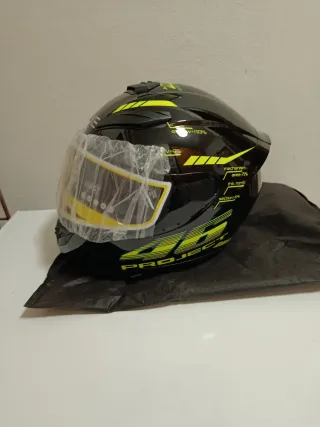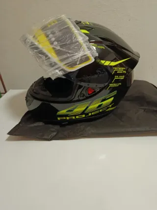 Casco da moto nero con dettagli gialli. Valentino Rossi taglia L - Design sportivo. - Visiera trasparente. - Logo Project sul lato.