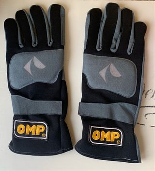 Guanti da rally/corsa o da karting prodotti da OMP, un noto marchio leader italiano di abbigliamento e accessori per il motorsport. Caratteristiche principali: Marca: I guanti presentano il logo OMP ben visibile sul cinturino in velcro regolabile. Materiale: Sono realizzati in PE e hanno il palmo in pelle scamosciata per garantire un'ottima presa sul volante. Design: Il design è leggermente precurvato per un maggiore comfort e sensibilità di guida, con cuciture esterne. Utilizzo: Modelli simili a questi sono comunemente usati nelle competizioni di rally, nelle corse automobilistiche o nel karting.